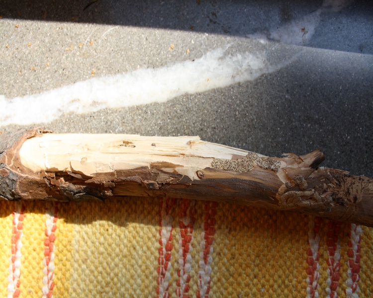 Ciao a tutti! Oggi stavo facendo la cernita della legna in laboratorio da passare a mio suocero per farci la brace, come sono uso fare in questa stagione ogni anno, al fine di liberare altro posto per le future raccolte in programma. E guardate un pò che bella sorpresa è saltata fuori da un ramo di abete rosso: Una graditissima sorpresa, considerando poi che questa legna era stata raccolta a Ottobre 2011 e ormai disperavo potesse ospitare ancora qualcosa, visto anche il terribile periodo di calura dei recenti mesi che l'aveva fatta seccare moltissimo (me ne ero un pò disinteressato a dire la verità  )... Ora, già che c'ero, ne ho approfittato per fare un pò di scatti interessanti. Vediamo come si presenta esternamente un ramo attaccato da questa rara ed interessante specie: Il ramo non è enorme, circa 5 cm. di diametro, la galleria si sviluppa prima molto tortuosamente. Man mano che si ingrandisce la traettoria diviene più stabile e prosegue per circa 10 cm. Più da vicino possiamo osservare la rosura: Come si nota, si tratta di rosura piuttosto fine. Il doppio colore dei detriti sta a significare che la larva, subcorticicola, intacca in parte la corteccia (da cui i residui rossicci) ed in parte il legno (da cui i residui chiari). Una volta matura essa penetra all'interno del legno secondo un modus operandi tipico del genere. Il segno della penetrazione è ben rappresentato da un tappino di rosura fine, compressa e uniformemente bianca (essendo, ovviamente, il prodotto soltanto della demolizione del legno): La celletta pupale è realizzata dalla larva all'interno del ramo, quasi nella zona midollare. E' lunga circa 2 cm. (sulla sinistra notiamo il tunnel da cui la larva è penetrata dall'esterno, privo di rosura nella sua parte terminale) : Ed ecco infine ancora un immagine del nostro amico: Purtroppo oltre a questo esemplare, maschio, ho estratto anche una femmina ma l'ho ferita durante le operazioni di estrazione. Mi dispiace molto perchè sono piuttosto sicuro che i due esemplari si sarebbero facilmente potuti far riprodurre in laboratorio, fornendo loro semplicemente un bel ramo di abete rosso appena tagliato dalla pianta. Ovviamente questo si sarebbe potuto fare se avessi tenuto gli insetti nelle cellette fino al naturale sfarfallamento, verosimilmente in Aprile/Maggio 2013. Tenterò a questo punto di procurarmi altri esemplari raccogliendo altra legna nelle peccete dell'Alto Adige. Spero ancora una volta di aver stuzzicato gli appetiti entomologici e fornito dati utili alla ricerca!