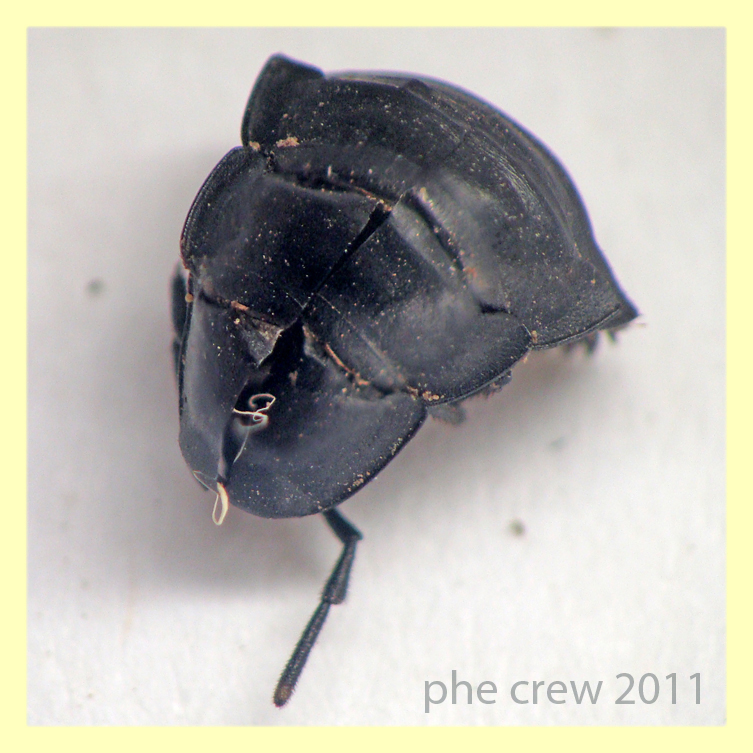 Individuare la punteggiatura elitrale, in questo caso, mi sembra problematico, visto che le elitre non si sono distese e sono rimaste molto rugose. Però probabilmente non è neanche necessario. Già la larva me lo faceva pensare, ma osservando la testa, sia nella pupa che nell'imago, e anche l'apparente mancanza di coste elitrali, direi che si tratta di Ablattaria laevigata, non di Silpha sp. Che si adatterebbe bene anche al cibo di cui si è nutrita la larva: le cozze vive possono essere un valido sostituto delle chiocciole vive di cui prevalentemente si nutrono in natura.