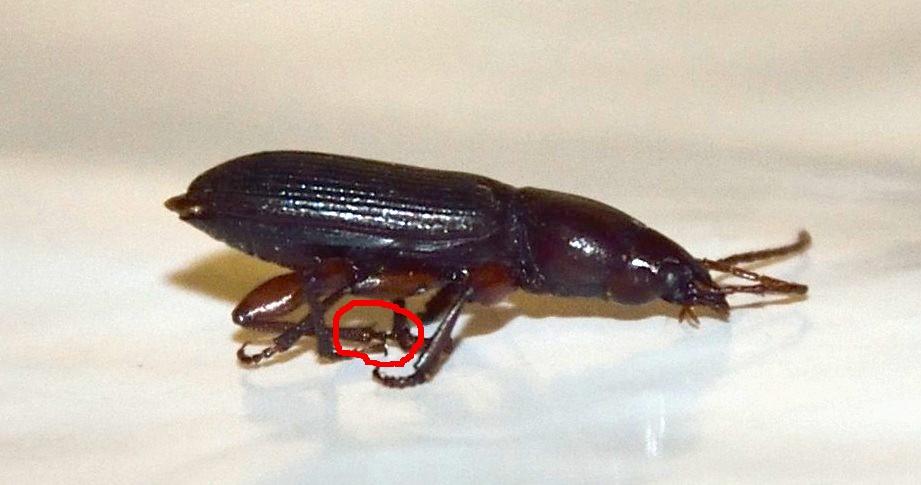 Da cosa si vede che non è uno Scybalicus? Dal capo allungato con gli occhi piuttosto piccoli, e dal primo articolo dei metatarsi poco più lungo del secondo, anzichè nettamente più lungo (la foto non è il massimo, ma si vede abbastanza):