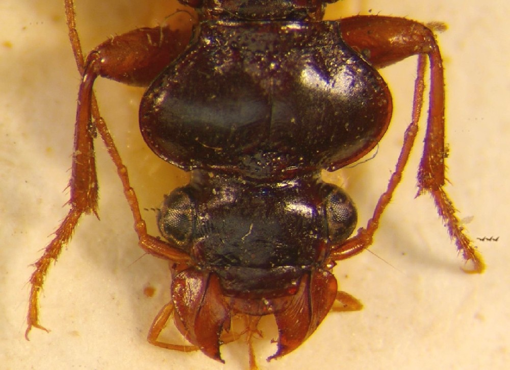 non avevo indicato quel carattere perché non sempre di agevole osservazione: talora esemplari catturati con trappole a caduta innescate con liquidi inadatti possono risultare irrigiditi e quindi con mandibole inapribili, e allora sono c...asi in cui conviene accontentarsi delle tempie :D