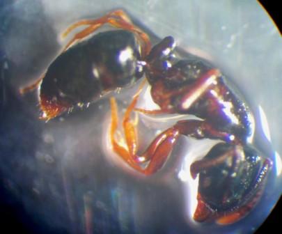 Servono altre foto e con esemplari asciutti (i riflessi e le distorsioni date dal liquido complicano tutto...). Puoi farle? Come dice Taumatomyrmex, quella scura è una ponerina, ma per sapere se del genere Ponera o Hypoponera è indispensabile vedere bene la parte ventrale del peziolo (la squama tra torace e addome) di profilo. Basta anche una foto non molto ingrandita, ma bisogna posizionare la zampa in modo che non copra il peziolo stesso. L'altra formica è una mirmicina, ma non riesco a capire se una Temnothorax (= Leptothorax, in parte) o un Tetramorium (così non posso escludere questo genere). Anche qui qualche foto dove si veda meglio ad esempio l'esemplare dal dorso e/o tutto l'animale di profilo, sarebbe utile. Ripeto però: asciuga gli esemplari (basta un po' di carta scottex). Ciao! maurizio