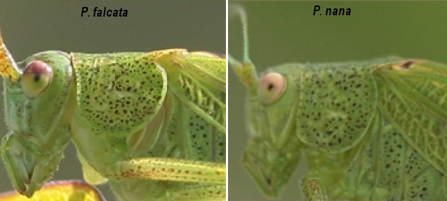 I caratteri distintivi delle due Phaneroptera italiane risiedono in prevalenza nella robustezza del corpo nel suo complesso. La P.nana è molto più corta e tozza rispetto alla falcata.