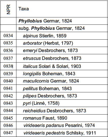 Gli unici sinonimi che trovo per il vespertinus sono Phyllobius artemisiae Desbrochers, 1873 e Phyllobius pyri var. vespertinus (Fabricius) :? :? , quindi "probabilmente" ci sarà qualche lavoro dove viene messo in sinonimia o escluso per la Fauna Italiana! :? :?