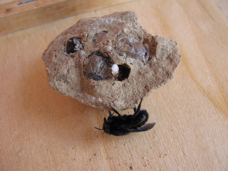 Quanto ai parassiti. lo scorso anno un amico raccolse un nido simile su un ramo di pino dal quale i Chalicodoma erano già sfarfallati e lo ripose in una scatola entomologica, durante l'estate si accorse che dal nido erano sparfallate 3 femmine di Leucospis gigas.