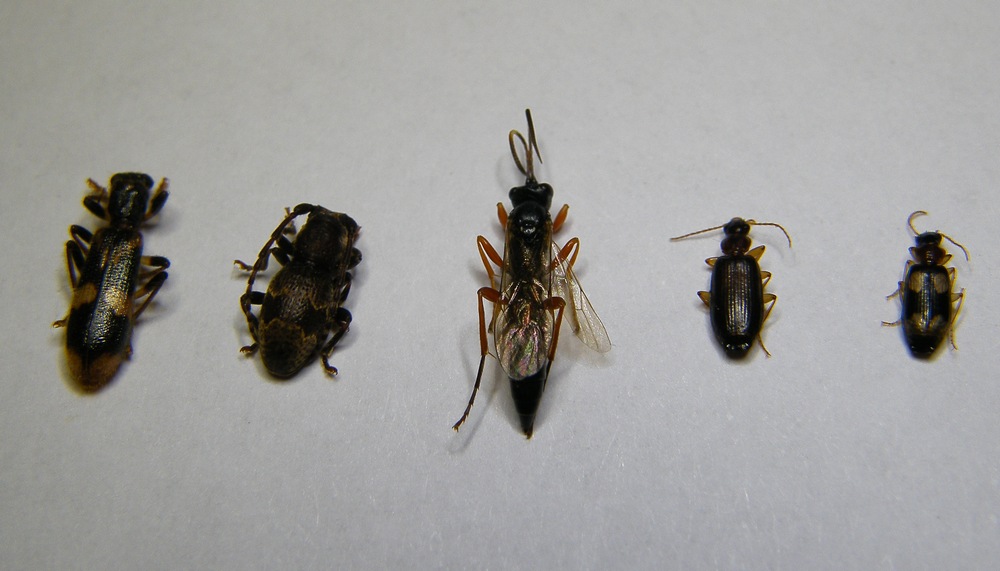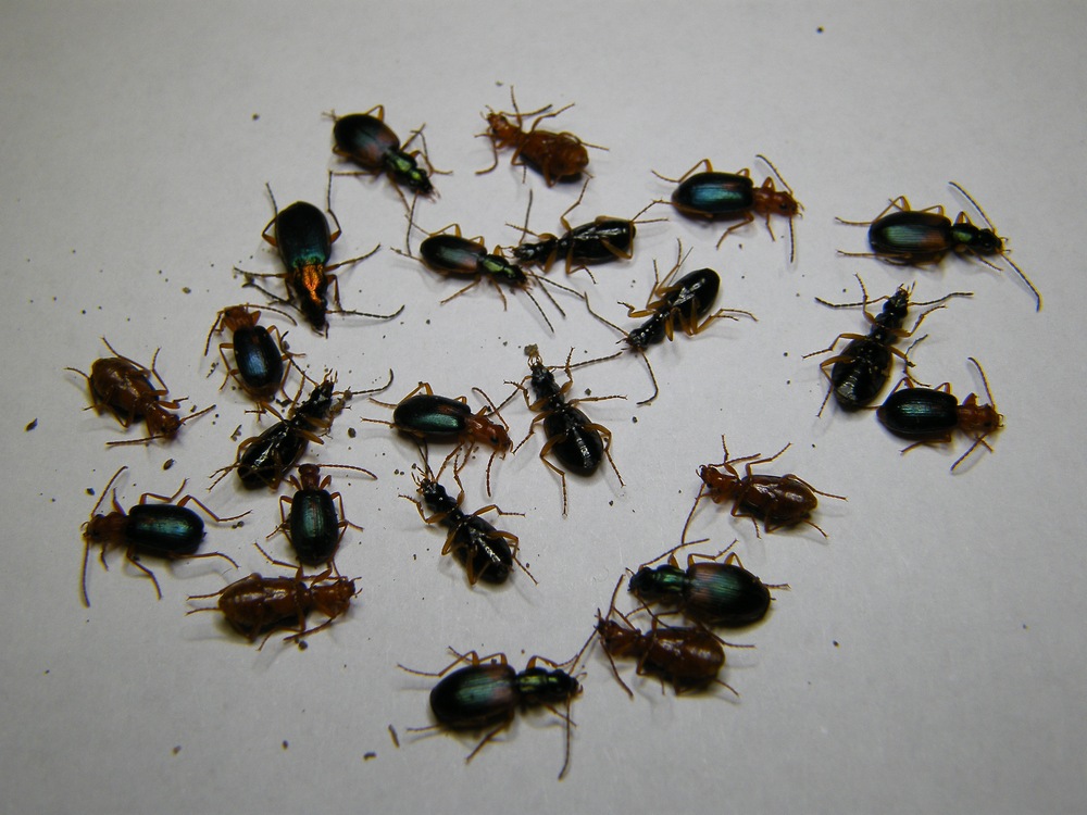 I due carabidi corticicoli sono molto probabilmente un Dromius meridionalis e un D. quadrimaculatus. Nella foto collettiva abbondano i Platynus dorsalis, più un Chlaenius chrysocephalus e Brachynus sclopeta (l'unico riconoscibile con certezza dalla macchietta gialla). Bello soprattutto il Cleride (Opilo sp.)!