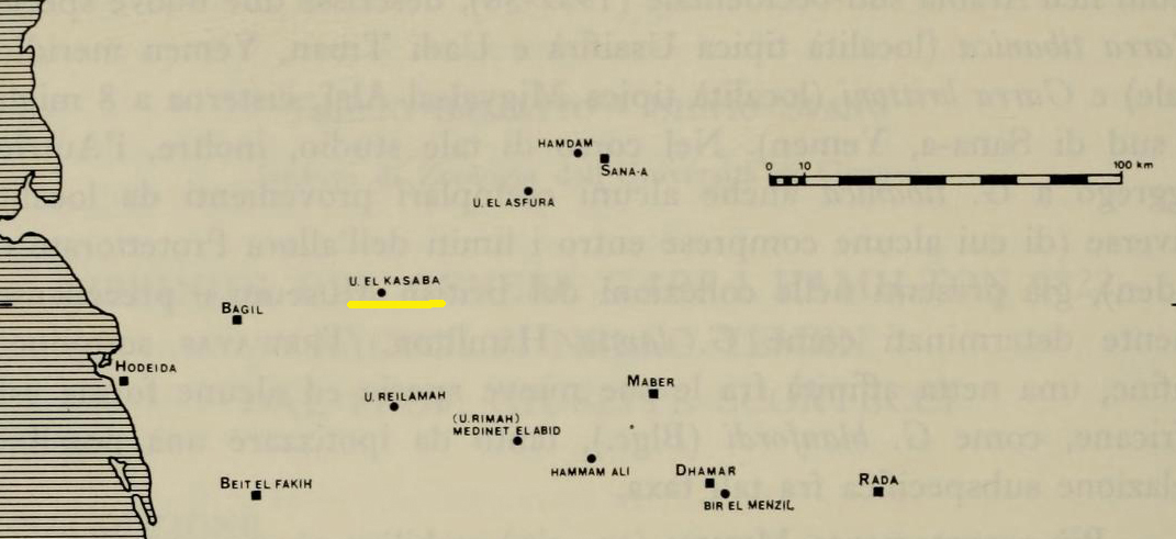 EUREKA Da: Balletto E., Spanò S., 1977 - Ciprinidi del genere Garra Hamilton 1822, raccolti nello Yemen dal Prof. Giuseppe Scortecci. Annali del Museo Civico di Storia Naturale `Giacomo Doria', 81: 246-287 Cartina riportata a pag. 248: Particolare: Prendendo a riferimento la distanza fra le due località di Bagil = (Bajil) e Hodeida = (Al Hudaydah) è facile ritrovare con buona approssimazione l'area in cui si trova El Kasaba, utilizzando questa mappa (clicca su "full-map" in alto a destra e poi rimpiccioliscila un po' per inquadrare anche Al Hudaydah, sulla costa. Se la rimpicciolisci ulteriormente vedi anche Sana'a)