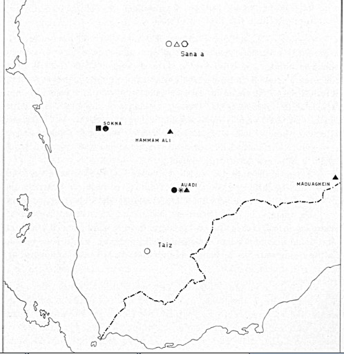 Qui ho trovato qualche altra indicazione, in particolare le coordinate di Mafhak, che non sono quelle di Hisn Mafhaq! E qualche altra cosa. Tra l'altro, ad un certo punto, facendo l'elenco delle località di un Katapaussus raccolto da Scortecci, alla fine indica: "Sana'a Uad Eozene e Uad el Kasaba", come a dire che queste due località sono non lontano da Sana'a, o almeno in quel governatorato. Queste le località attualmente individuate: Dalla posizione trovata da MB per lo Jabal Haraz, e dalla morfologia del territorio e dall'altezza indicata, si può dedurre la posizione dello Uadi Ezone (o sarà Wadi Eozene?), che ho indicato nella cartina seguente. Wadi al Kasaba non dovrebbe essere lontano.