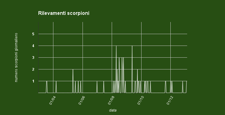 ad integrazione, allego il grafico del mio monitoraggio scorpioni dall'anno scorso (vedasi intensificazione nel periodo tardo estivo).