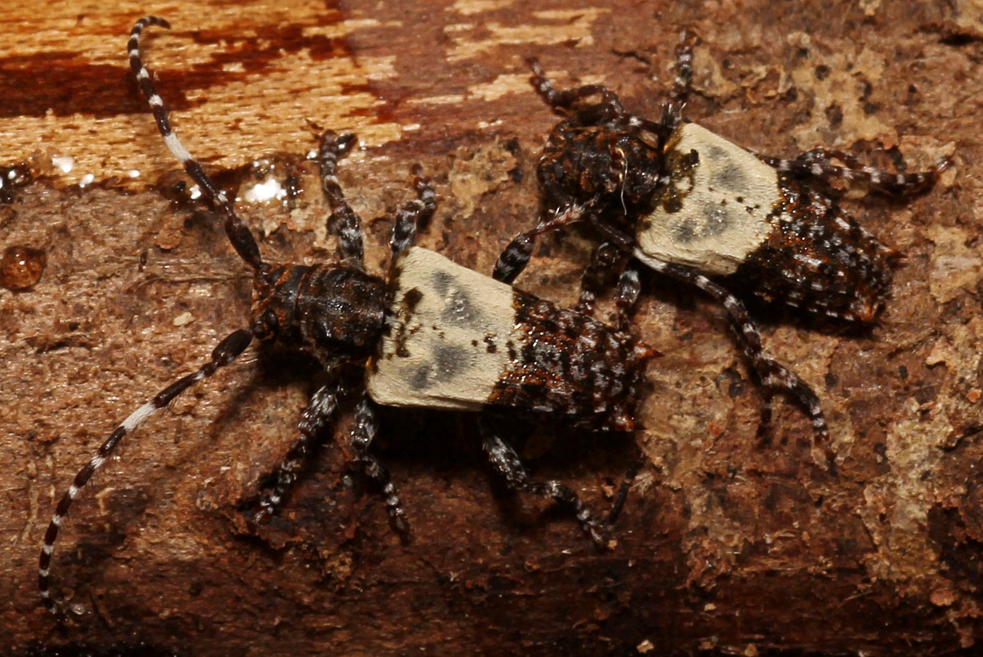 Dopo aver tolto i pezzi di legno, fradici e gelati, ho visto che nell'acqua galleggiavano tre Pogonocherus annegati! Allora ho controllato dove fossero i fori, e con sorpresa mi sono accorto che gli unici due pezzi di legno che non erano stati sommersi completamente erano tutti picchiettati di macchiette bianche. Ogni macchietta, come ho visto mettendo gli occhiali, era un Pogonocherus! Tutti lì come su una zattera per non annegare! E visto che erano (sono) vivi, dovrebbero essere usciti da poco, magari proprio per sfuggire all'acqua.