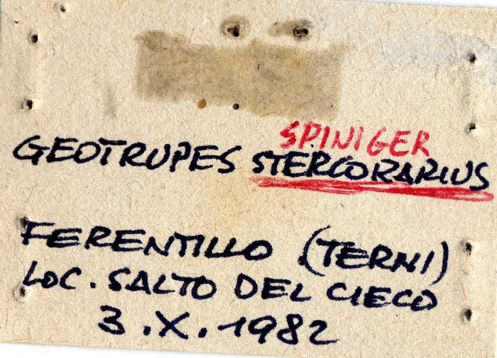 Questa bustina conteneva un Geotrupes spiniger (quella correzione in rosso è scritta da me, ma ce n'era già una sulla pellicola trasparente... Ignoro se possa risalire al raccoglitore o se sia stata aggiunta in seguito)...