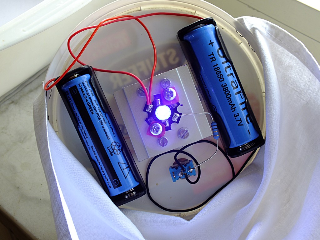 La luce è emessa da uno dei soliti led cinesi UV da 3W, alimentato da due pile al lito 18650 da 3.7 V in parallelo, ciascuna da 3800 MAh. Autonomia teorica: 10-11 ore. Più che sufficiente per restare acceso dalle 7 del pomeriggio alle 5 del mattino.