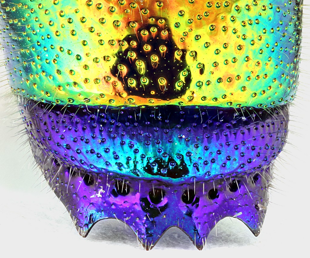 infine, la punteggiatura dell'area mediana dello scutum nel calens è uniformemente densa e grossolana su tutta la superficie; occasionalmente lo stesso si può osservare nel cyanurum, ma la punteggiatura come in questo, densa e grossolana a ridosso dello scutello, fine e spaziata sul resto della superficie, indica senza incertezze il cyanurum