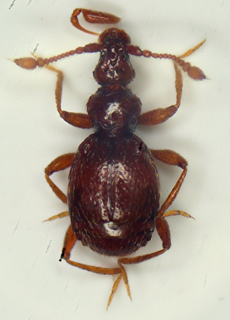 Citando il Besuchet: ….(1.7-1.8 mm.) Téte pratiquement aussi longue que large, les yeux étant réduit chacun à deux ou trois ommatidies dépigmentées. Dernier article des palpes maxillaires (0.33-0.35 mm) assez grand. Scape déprimé, subparalléle, simple .