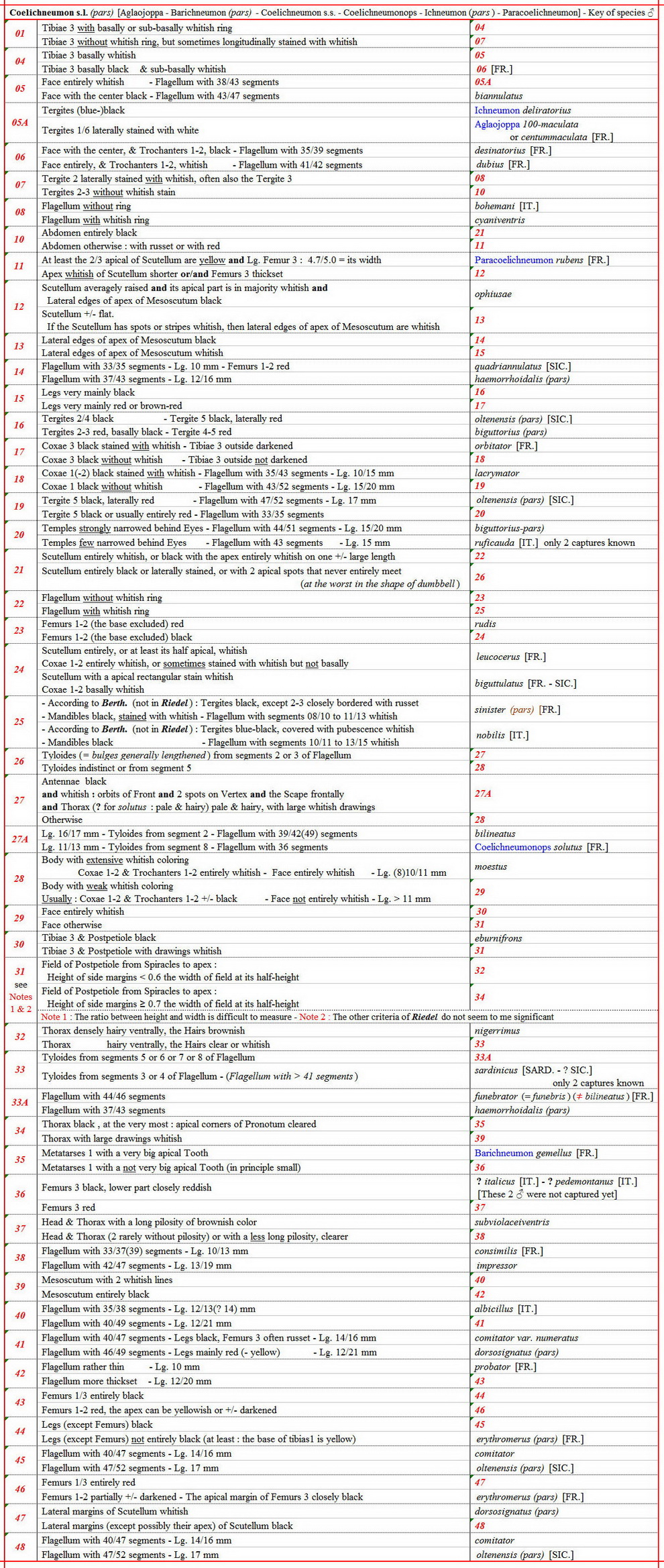 I followed the key of Riedel up to the couplet 08 (except the couplet 05A for 2 species which are not Coelichneumon s.s.), then I separated from it when couplet were few or not at all convincing.