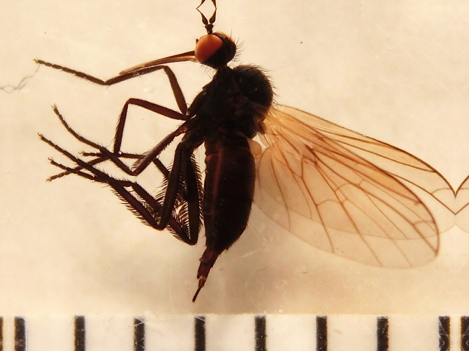 Io direi Empis sp.; sulla foto non sono visibili dettagli necessari per cercare di andare oltre. A questo proposito, dovresti cercare di mettere meglio a punto il sistema di illuminazione; la nitidezza è buona, ma ci sono troppe zone del soggetto in ombra. Con qualche sistema di diffusione tipo i soliti bicchierini bianchi - ci sono diverse discussioni che trattano l'argomento nella sezione 'tecniche fotografiche - potresti ottenere risultati molto più validi.