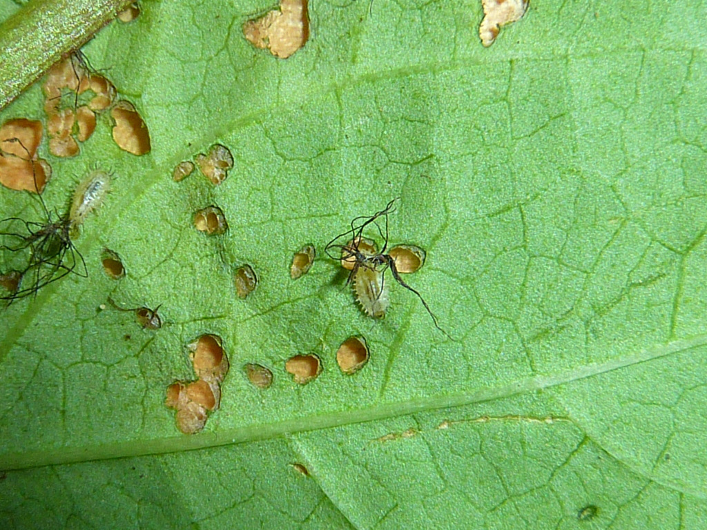 Il 27 agosto ho notato il primo accoppiamento e trovato alcune ooteche (immagine 4), di forma inusuale rispetto a quelle delle specie italiane che conosco, e il 4 settembre ho trovato le prime larve (circa 20), lunghe circa 0.5 mm, di colore verde molto chiaro che in pochi giorni sono cresciute di vari mm e che invece dell'usuale scutello mostravano alle terga una sorta di "festoni" di escrementi (immagini 5 e 6). Successivamente ai "festoni" si sono aggiunte le spoglie delle mute precedenti (immagini 7 e 8). Tra il 20 e il 21 settembre le larve si sono tutte impupate e sono sfarfallate tra il 27 e il 28. Il 3 ottobre ho osservato il primo accoppiamento della "seconda generazione".