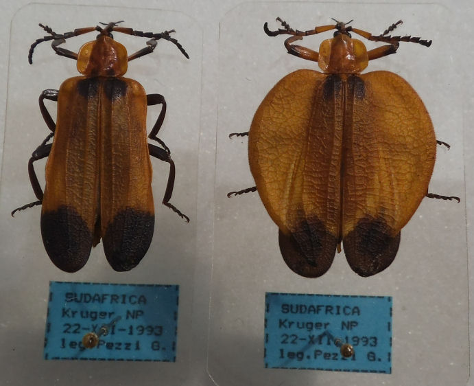 Ho cercato un bel po' sul web e ho trovato una pubblicazione che cita due specie simili del parco ma l'altra (melanurus) è diversa (spine umerali, reticolazione elitrale diversa e colori diversi). Quel che è curioso è che pare che le elitre siano snelle o allargate non necessariamente secondo il sesso. Nel mio caso il maschio le ha allargate. La reticolazione elitrale e la colorazione del torace e antenne è quella di Lycus trabeatus Guérin-Méneville.