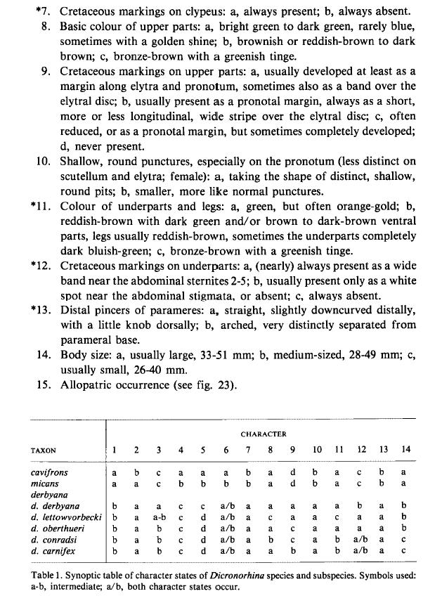 ti metto la tavola sinottica dei caratteri di questo lavoro sul genere Dicronorhina che dovrebbe aiutarti