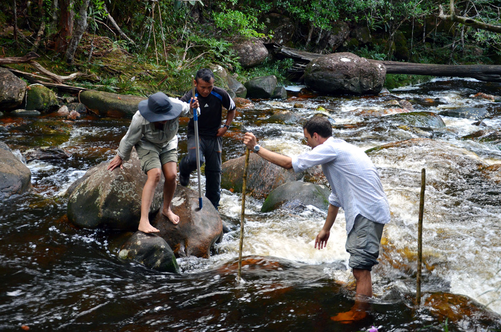 Dopo 6 km di savana entriamo nella rigogliosa foresta che circonda l' Akopán: il sentiero é in leggera salita ma occorre attraversare alcuni torrenti dalla corrente impetuosa nei quali tutti, prima o poi, siamo scivolati, per fortuna senza conseguenze.