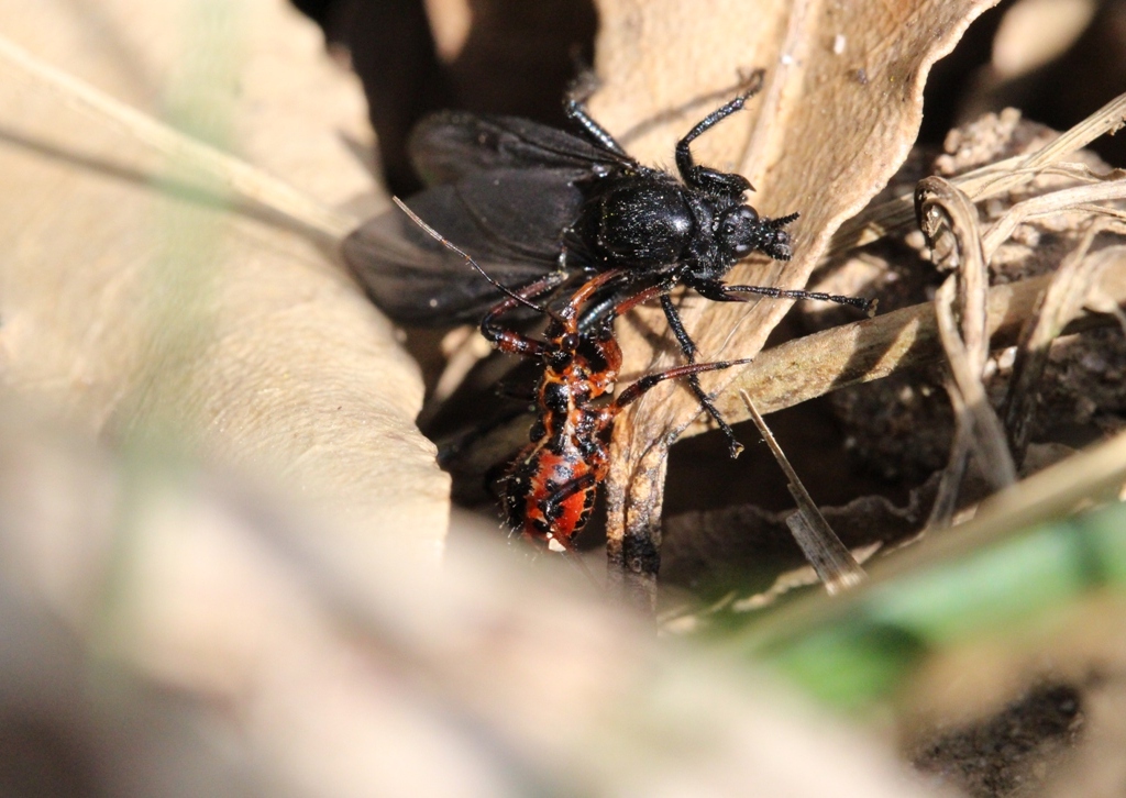 L'eterottero è una ninfa di Rhynocoris sp., famiglia Reduviidae, il dittero è invece una femmina di Bibio marci (Linnaeus, 1758) famiglia Bibionidae.