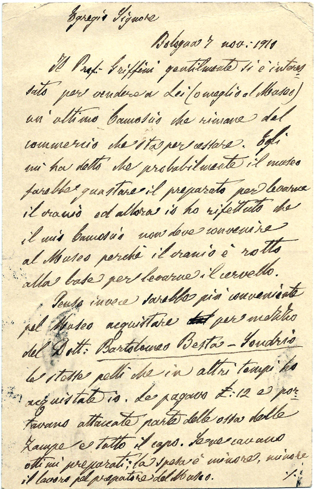 Il Prof. Griffini gentilmente si è interessato per vendere a Lei (o meglio al Museo) un ultimo Camoscio che rimane del commercio che sta per cessare. Egli mi ha detto che probabilmente il museo farebbe guastare il preparato per levarne il cranio ed allora io ho ripetuto che il mio Camoscio non deve convenire al Museo perché il cranio è rotto alla base per levarne il cervello.