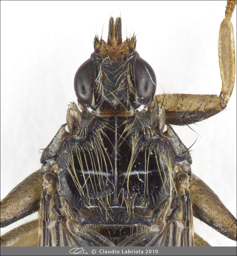 Difficile cogliere i caratteri differenziali riportati nelle chiavi, mi sa che l'unico rilevabile é la proporziona tra l'interdistanza antennale e la minima distanza tra gli occhi, questa mi sembra decisamente più stretta ed orienterebbe quindi per P. garzettae, per contro le setole molto chiare e numerose propenderebbero per canariensis, ...