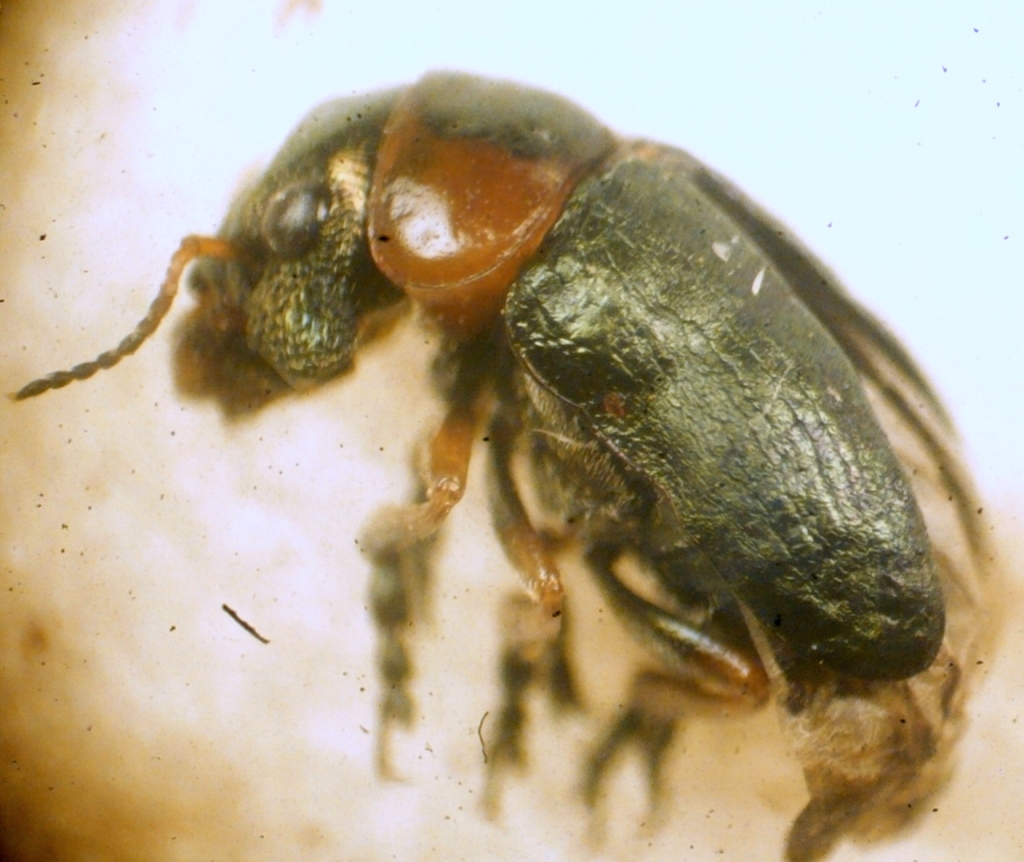 Secondo me, difficoltà al momento della fuoriuscita dell'adulto dalla cuticola pupale (in particolare, delle elitre dalle pteroteche) e sclerificazione non ottimale delle elitre, rese un po' deformi per i problemi di uno sfarfallamento faticoso e protratto. Altrimenti, trauma meccanico di qualche natura sull'individuo neosfarfallato e ancora "molle".