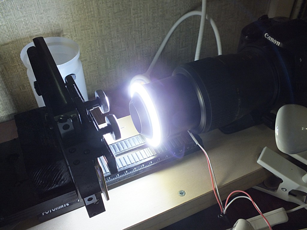 Continuano le prove. Oggi ho aggiunto un diffusore davanti al led anulare: un pezzo di bottiglia di plastica spruzzato con vernice bianca, in attesa di averne una in plastica bianca, che farà passare meglio la luce. L'ho fissata ad incastro su un anello sull'obiettivo, non al piano porta-insetti.
