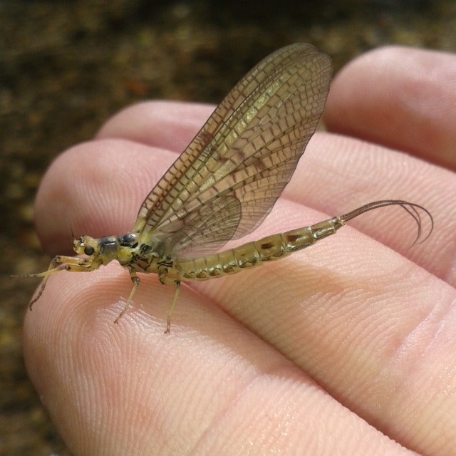 Ciao Nicola, l'effimera della foto è un esemplare femmina di Ephemera danica allo stadio di subimago, ossia appena mutato da ninfa subacquea ad insetto alato; nell'arco di un paio di giorni affronterà un'altra muta per diventare insetto maturo e pronto per l'accoppiamento.