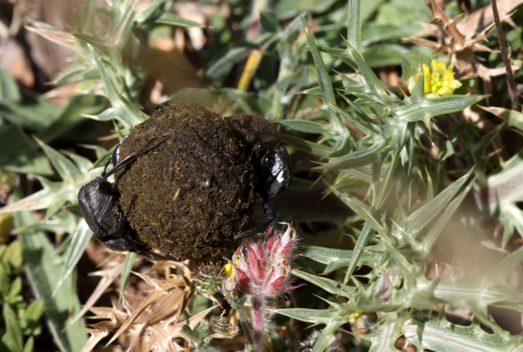 Una coppia di Sisyphus che collaboravano allo spostamento della loro pallina. In altre occasioni mi era capitato di osservarli all'opera su terreni relativamente più "facili", come distese di sabbia o tratti di suolo con poca vegetazione. Qui erano piuttosto in difficoltà, visto che il substrato pieno di piante spinose bloccava in continuazione l'avanzamento del loro tesoro.