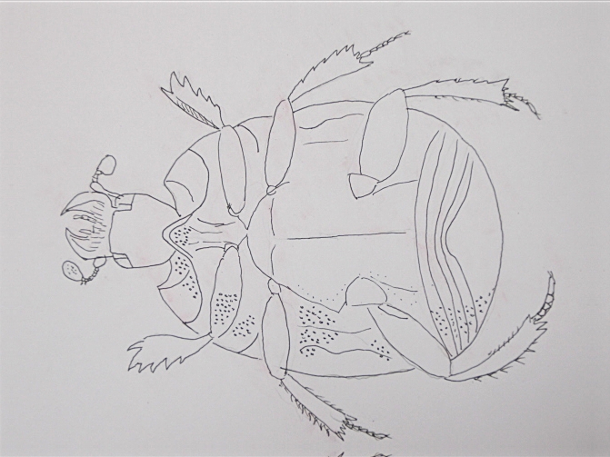 Procedendo verso la sutura elitrale si incontrano altre due strie, lunghe rispettivamente circa un terzo e circa un quarto delle altre quattro, l’ultima raccordata con una successione di punti grossolani allineati che orla l’estremità distale dell’elitra stessa.