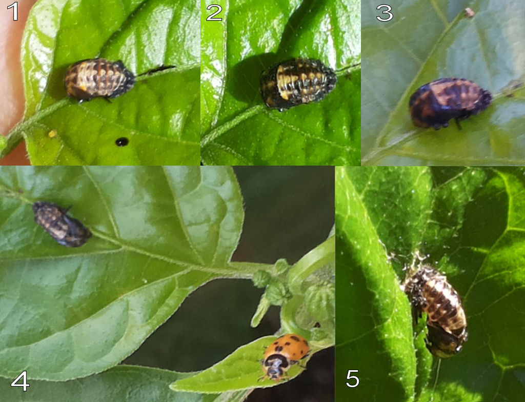 Guarda che già nella tua ultima foto la pupa in alto a destra è già solo "un guscio vuoto". Se ci fai caso, la parte anteriore è aperta, cosa che indica che la coccinella è uscita. Magari era proprio quella che si vede in basso a sinistra.