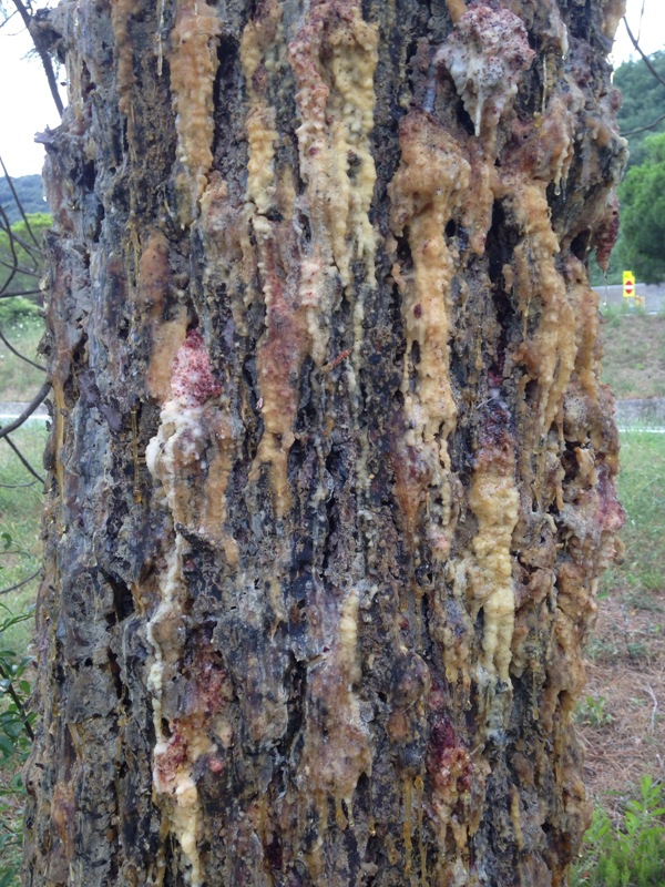 La mia curiosità si è presto tramutata in stupore, perché non avevo mai visto un pino vivo, ma cosparso di resina che colava lungo l'intero tronco da un altezza di ca 3,5 metri fino a terra. Tutto attorno. Sembrava che la resina gli uscisse da una serie di fori su tutta la superficie del tronco.