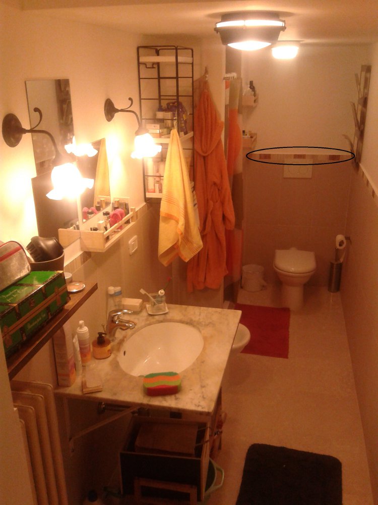In effetti la foto del bagno chiarisce il mistero. Quelle che sembravano "piastrelle" in realtà altro non erano che un motivo ornamentale, evidentemente costituito da strisce (in cotto?) larghe pochi mm affiancate l'una all'altra. E l'insetto è stato fotografato sullo scalino tra la parete pitturata di bianco e la parte inferiore piastrellata, che come succede normalmente, sporge un po' rispetto alla parte superiore della parete.