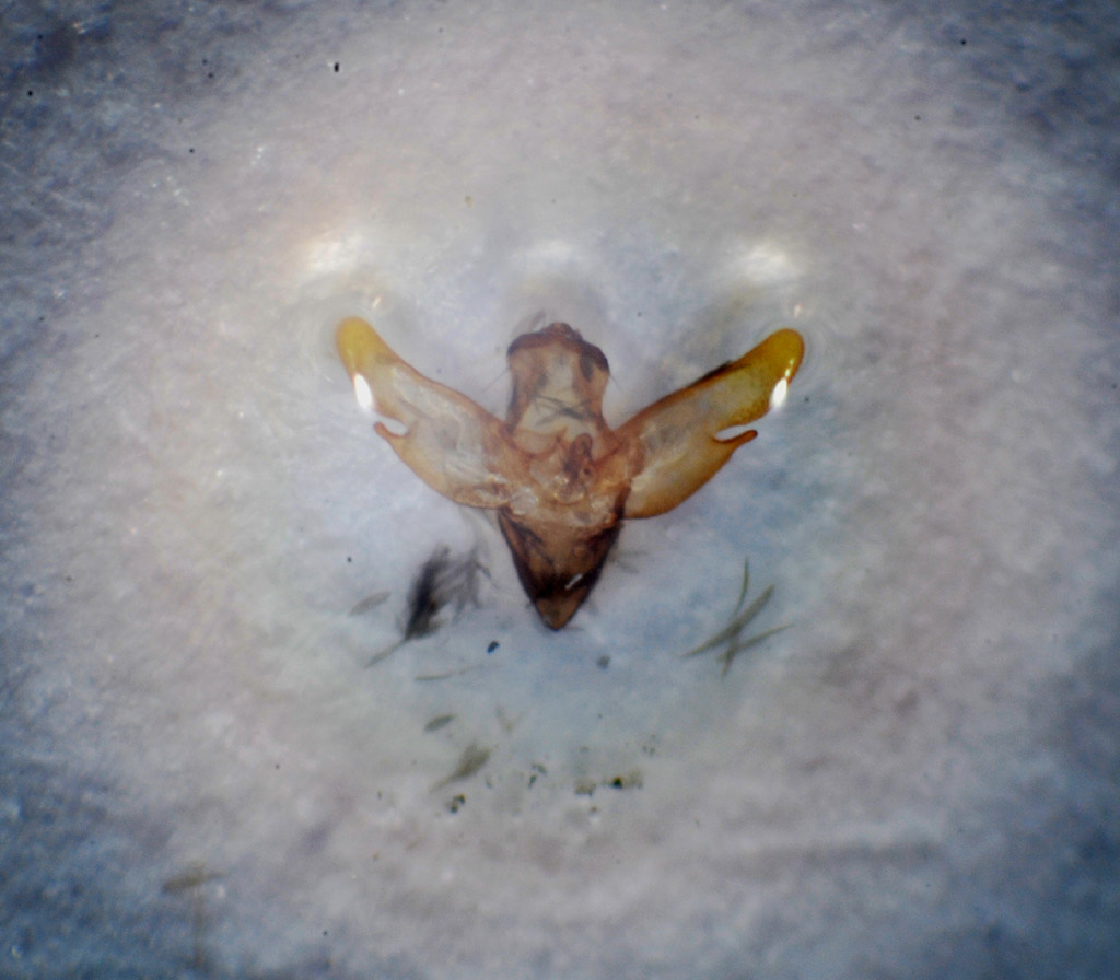 Qui, sempre molto ingranditi, i genitali (tra una valva e l’altra ci sarà 1 mm).