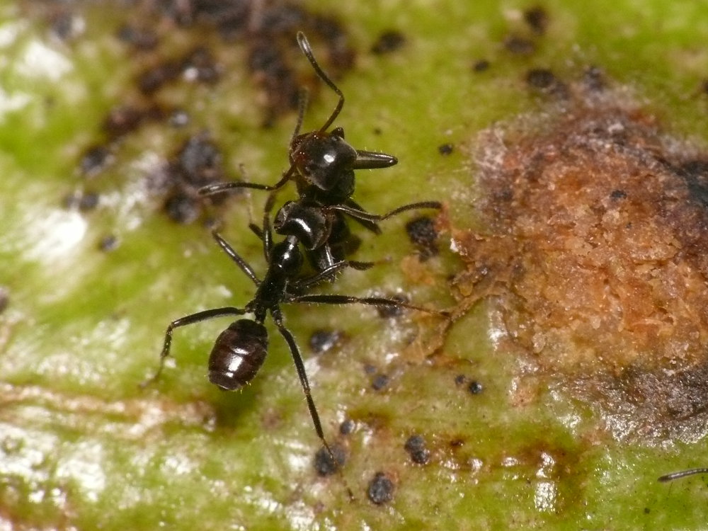 It was interesting that they've build chambers in the pits of a ripe guanábana fruit and on the exterior cared about some membracidae nymphs.