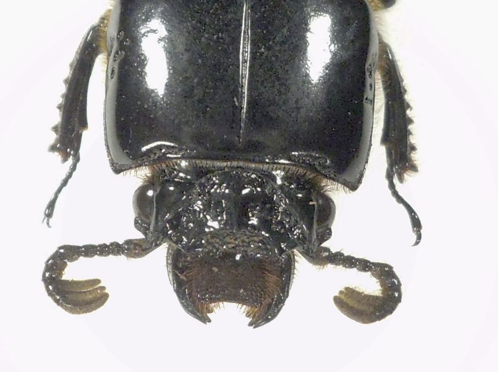 So che è difficile ma ci provo con un paio di specie: la prima è questa. mm 33. parte anteriore del capo con quattro denti equidistanti. Fronte con tre tubercoli, quello centrale ben più lungo e sporgente in avanti. Capo anteriormente e nei solchi laterali con forte punteggiatura. Con le chiavi arrivo a Passalus s.s. ma non ne sono sicuro (nialus group?).