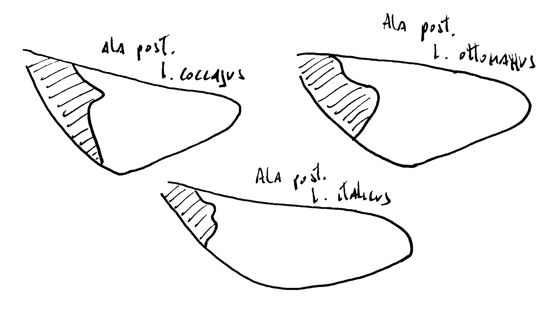 Per quanto riguarda la distinzione tra L. coccajus, L. latinus (= italicus) e L. lacteus (= ottomanus), tre specie a colorazione giallo/bianca (le prime due) o solo bianca (la terza) che puoi trovare in Abruzzo, basta guardare la forma della macchia nera dell'ala posteriore oltre alla forma dell'ala stessa. Ti posto un mio vecchio schizzo (scusa per la calligrafia).