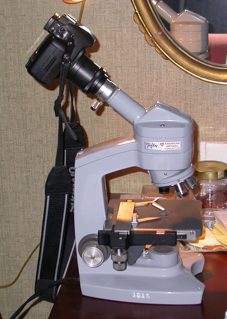 Per la reflex ho fatto al contrario, ho preso un microscopio in funzione di questa. Ho acquistato sul web un American Optical a circa 50 US$. C'era qualche segnetto (ci hanno inciso un numero direttamente sul metallo :devil: ) ma in perfette condizioni. Ho cambiato gli obiettivi (alcuni) con altri migliori, ed ho comprato un raccordo per fissarci una reflex con attacco a vite 42x1, a cui ho fissato un adattatore vite - baionetta Olympus 4/3. Nell'adattatore ci sarebbe lo spazio per inserire un oculare, ma ho visto che non serve, Montata direttamente la reflex, viene inquadrato un campo poco più piccolo del campo visivo che si ha con l'oculare montato, e non si ha alcuna vignettatura.