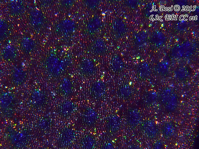 Bisogna però ingrandire ancora, arrivare almeno ai 400x complessivi, per vedere chiaramente che ogni cellula dell’elitra non è piatta, ma ha una forma di calotta emisferica. Di conseguenza, la luce incidente attraversa degli strati di chitina più spessi nelle pareti e più sottili al centro, formando così, per ogni cellula, sfumature diverse dello stesso colore: più scure ai bordi, più chiare al centro.