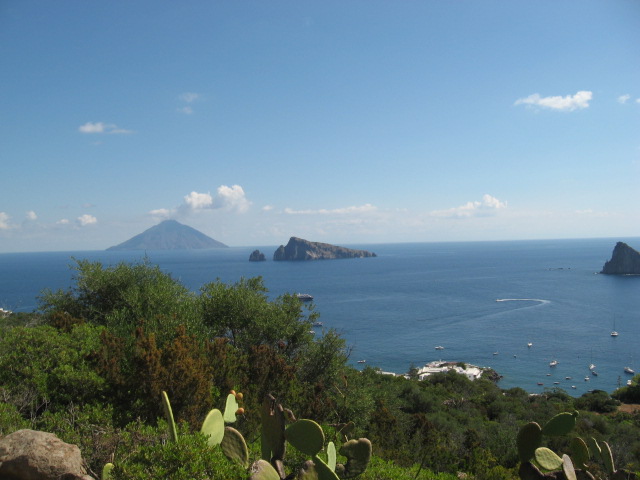 Continuo a salire, e intanto la sagoma di Punta del Corvo già si intravede chiaramente fra la vegetazione, che si dimostra più strutturata in quota con vetusti corbezzoli, ginestre spinose ed eriche. Tali fitocenosi sono il frutto di una ricolonizzazione dell'isola da parte della flora spontanea sugli antichi terrazzamenti un tempo coltivati e abbandonati in seguito ai grandi flussi di emigrazione verificatisi nelle Eolie fra il XIX e il XX secolo, che ha visto l'arcipelago letteralmente spopolarsi. Poi, con l'avanzata del turismo, i coltivi nella gran parte dei casi non sono stati reimpiantati. Punta del Tribunale (170 m s.l.m.) Vista da Pizzo Corvo. Sullo sfondo Lipari e Vulcano Finalmente in cima! Dalla vetta si gode di una completa veduta degli isolotti minori di Panarea nonchè di Stromboli