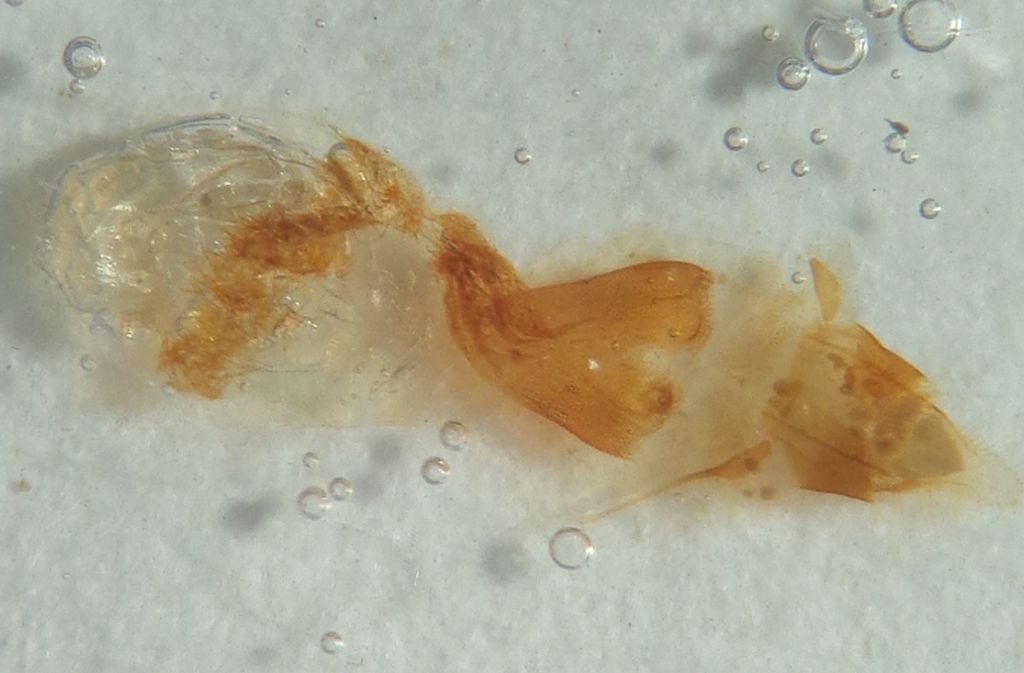 Dopo tanto tempo ho deciso di identificare alcune ficitine in sospeso tra le quali questa femmina: si è rivelata essere Alophia combustella (Herrich-Schäffer, 1855), specie dalla biologia particolare, legata pare alle galle di afidi fordini del gn. Pistacia; ciò mi ha fatto scoprire che i dati sono errati e che la specie è stata raccolta nel materiale di cacce notturne autorizzate a Monte Mauro, Vena del Gesso di Brisighella (RA), 450 m, una delle quali in data 03.06.2004 (come da appunti di viaggio), ove esiste il terebinto: quindi i dati vanno corretti. L'errore è forse dovuto alla contemporanea caccia negli stessi giorni in un bosco di Bagnacavallo, in pianura, dove non vi sono piante di Pistacia. Posto il preparato dell'apparato femminile, con la caratteristica fascia di spinule della bursa.