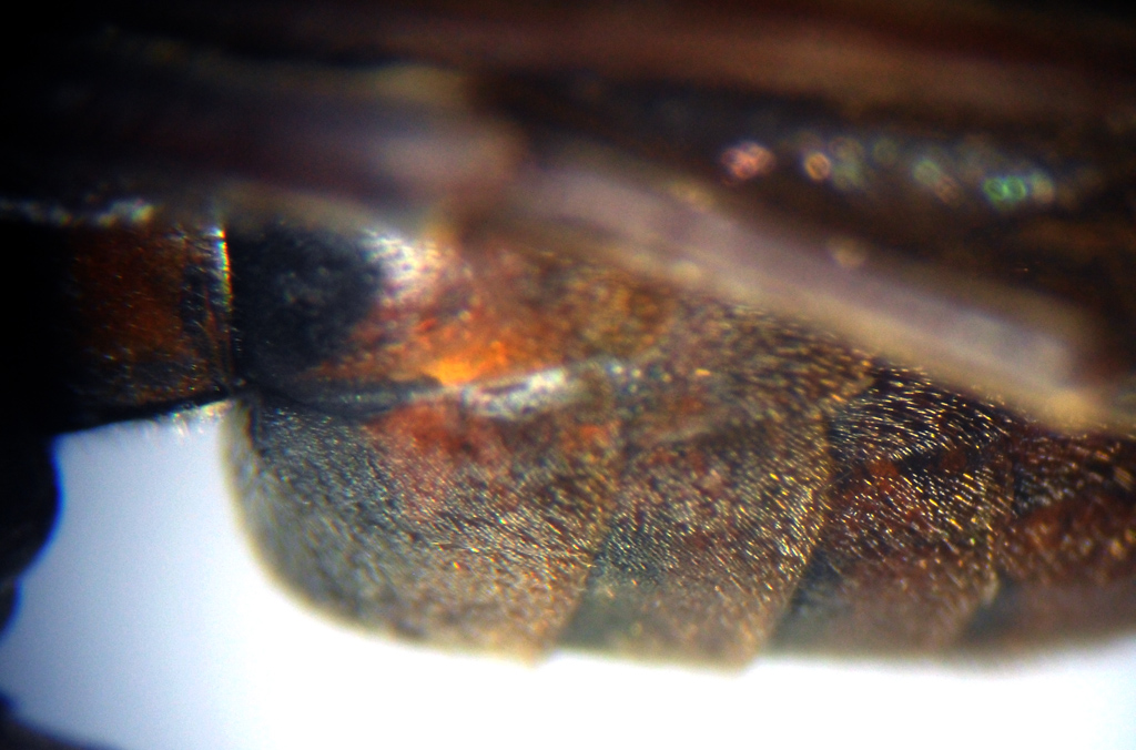 Si riconosce facilmente per la colorazione e il secondo sternite particolarmente sporgente alla base.