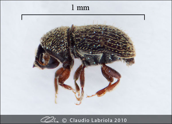 Adulto: da 1 a 1,3 mm di diametro, nero, matto, con le elitre bruno nerastre e le interstrisce di peli piegati, chiari, che gli danno un' apparenza grigio cenere. Forma generale massiccia, oveae. Protorace arrotondato e possente, elitre rettangolari, arrotondate all'estremità.