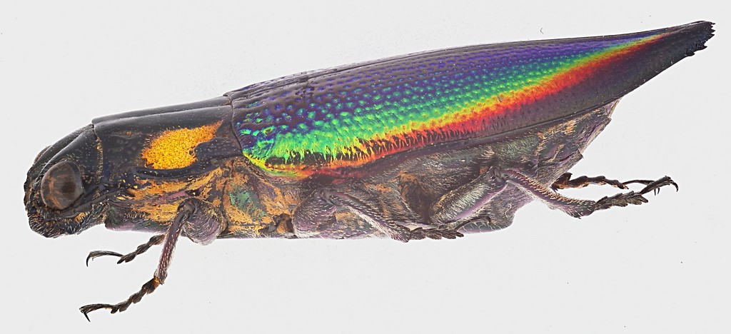 Mi permetto di insere questa mia ipotesi sul perchè le "elitre sono curvate verso l'alto". La posizione è un semplice stratagemma di comunicazione con altri esemplari della stessa specie: uno specchio che rifrange la luce e comunica la presenza non verso il cielo, ma verso un piano di circa 180°. Il buprestide si orienta contro il sole e quindi riflette la sua luce in un ampio spazio: brilla. :D