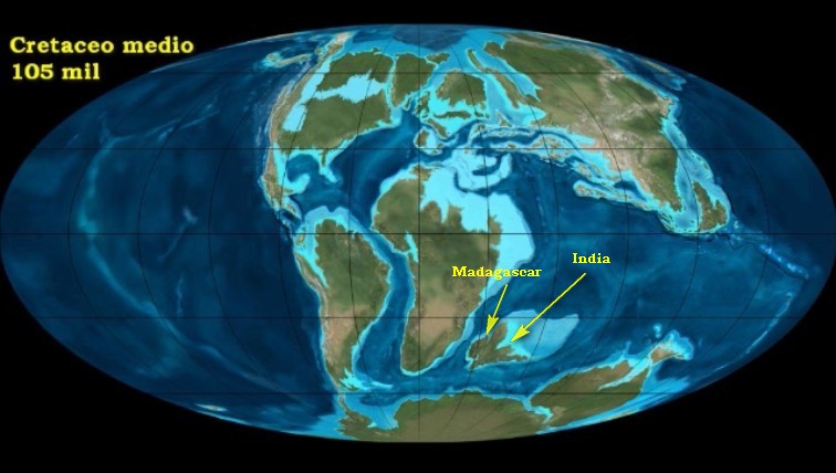 Il pensiero mi aveva sfiorato, anche perché da qualche parte ho visto una cartina di un periodo prossimo a quello della mappa che ho inserito prima, in cui erano segnate delle correnti che scorrevano verso Sud, nello stretto Oceano Atlantico in formazione tra Sud America ed Africa, passavano a Sud dell'Africa e proseguivano, dividendosi in due, tra Africa e Madagascar/India e tra questo blocco e Antartide/Australia. Per cui, non è impossibile che qualche ammasso di vegetazione con larve di antiche specie di Actenodes, trasportato da quelle correnti, dalle coste del Sud America sia finito per arenarsi in Madacascar. Considerando che circa 65 milioni di anni fa la situazione era come da mappa seguente, si dimezzerebbe l'antichità dell'antenato comune delle Actenodes americane e malgasce. Comunque non mi convince molto.