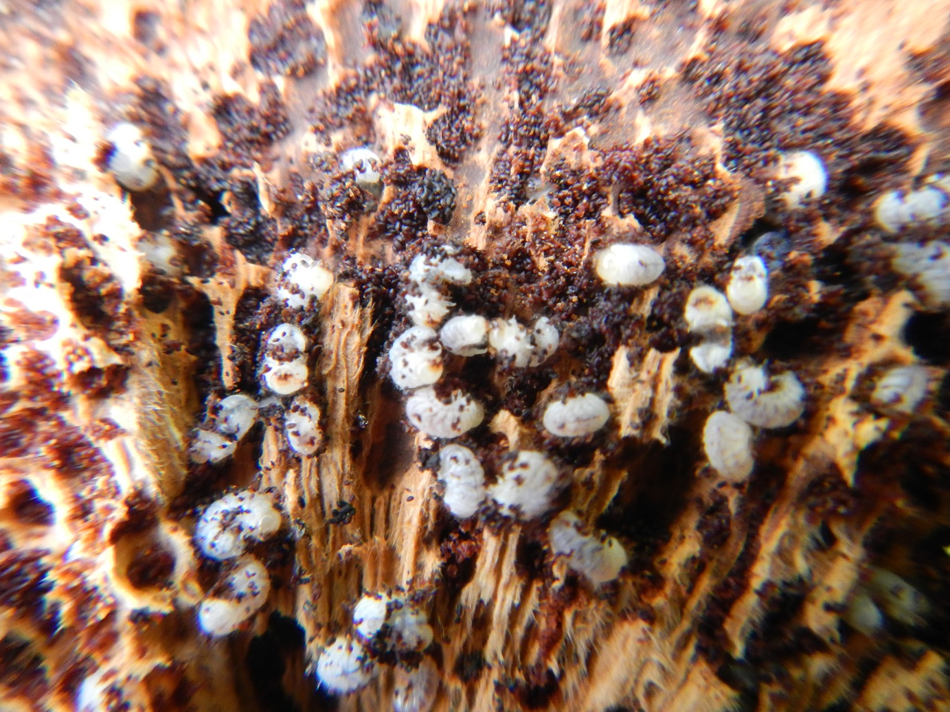Aprendo un fungo attaccato ad uno di quegli alberi a destra noto una intensa infestazione di queste larve di coleottero. Cosa potrebbero essere?