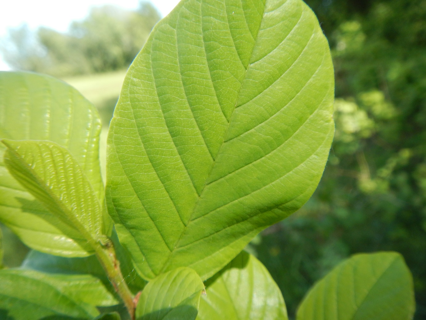 Giovane pianta di Rhamnus frangula (=Frangula alnus) con le sue foglie caratteristiche. Tra qualche settimana, con un po di fortuna, spero di trovare qualche Oberea pedemontana su quei cespugli.