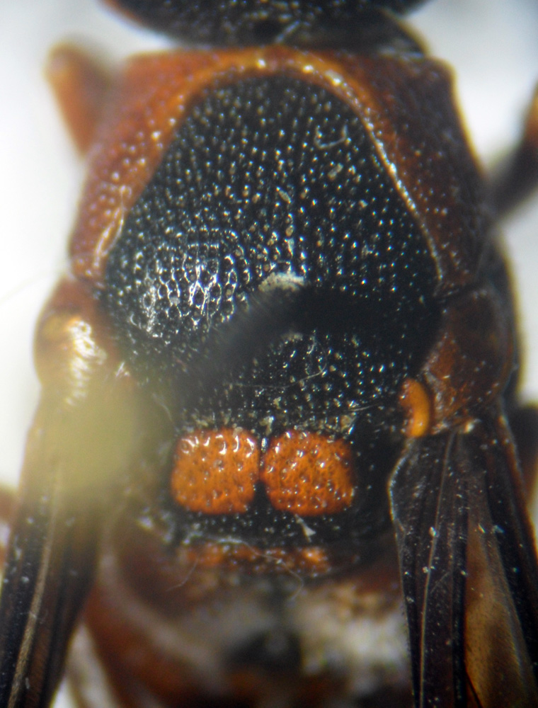 Si riconosce per il secondo sternite poco sporgente alla base, le carene propodeali assenti e il propodeo quasi interamente liscio con pochissimi punti. Anche la bellissima colorazione è molto caratteristica.
