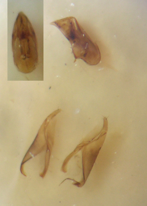 The genitalia is very similar to those of Atheta aeneicollis. There are only small differences in the aedeagus (lateral view) and spermatecha morphology, but are probabily caused of intraspecific variability of this species (or of my inaccurate preparations).
